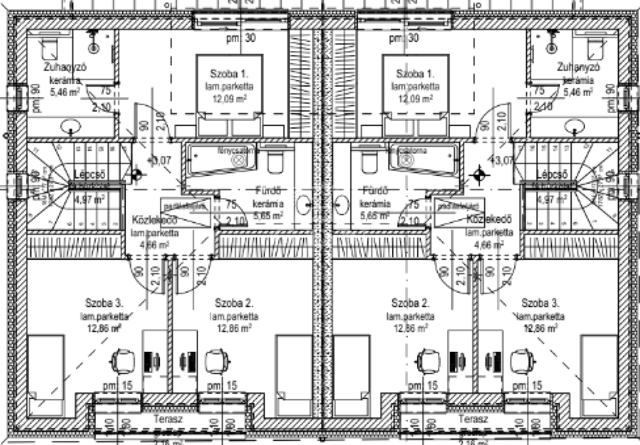 A műszaki tartalom korszerű és energiatakarékos: hőszivattyús rendszer, padlófűtés, mennyezeti hűtés-fűtés az emeleten, 3 rétegű nyílászárók, 15 cm szigetelés.