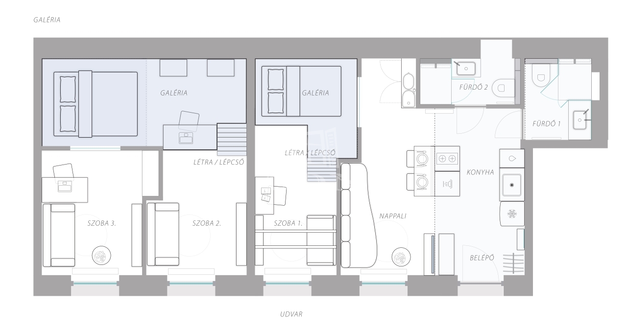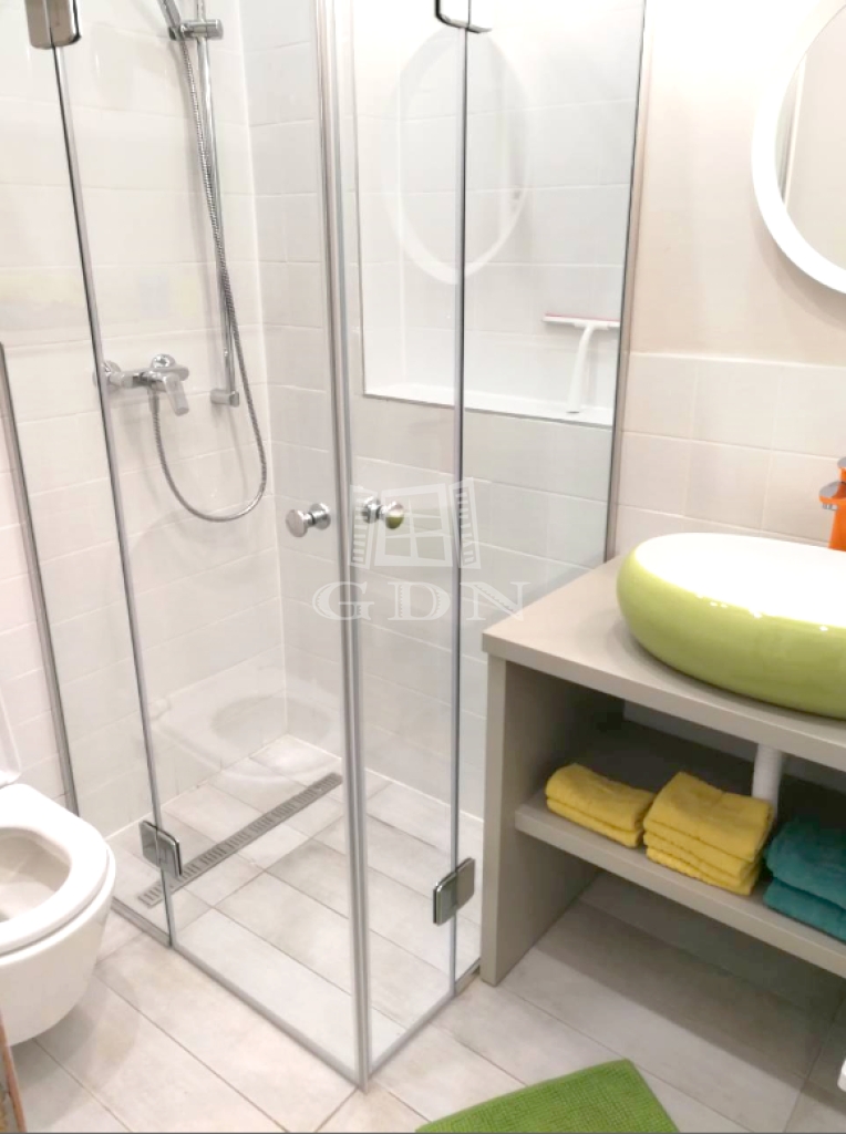 A 2017-ben teljeskörűen, lakberendező közreműködésével felújított, modern, 61 m²-es lakás amerikai konyhás nappalival rendelkezik, mellette három különnyíló, jól használható galériázott hálószoba található (11, 12 és 15 m²), továbbá két fürdőszoba (mindkettő WC-vel, mosdókagylóval és zuhanyzóval felszerelt, az egyikben mosó-szárítógép is van).