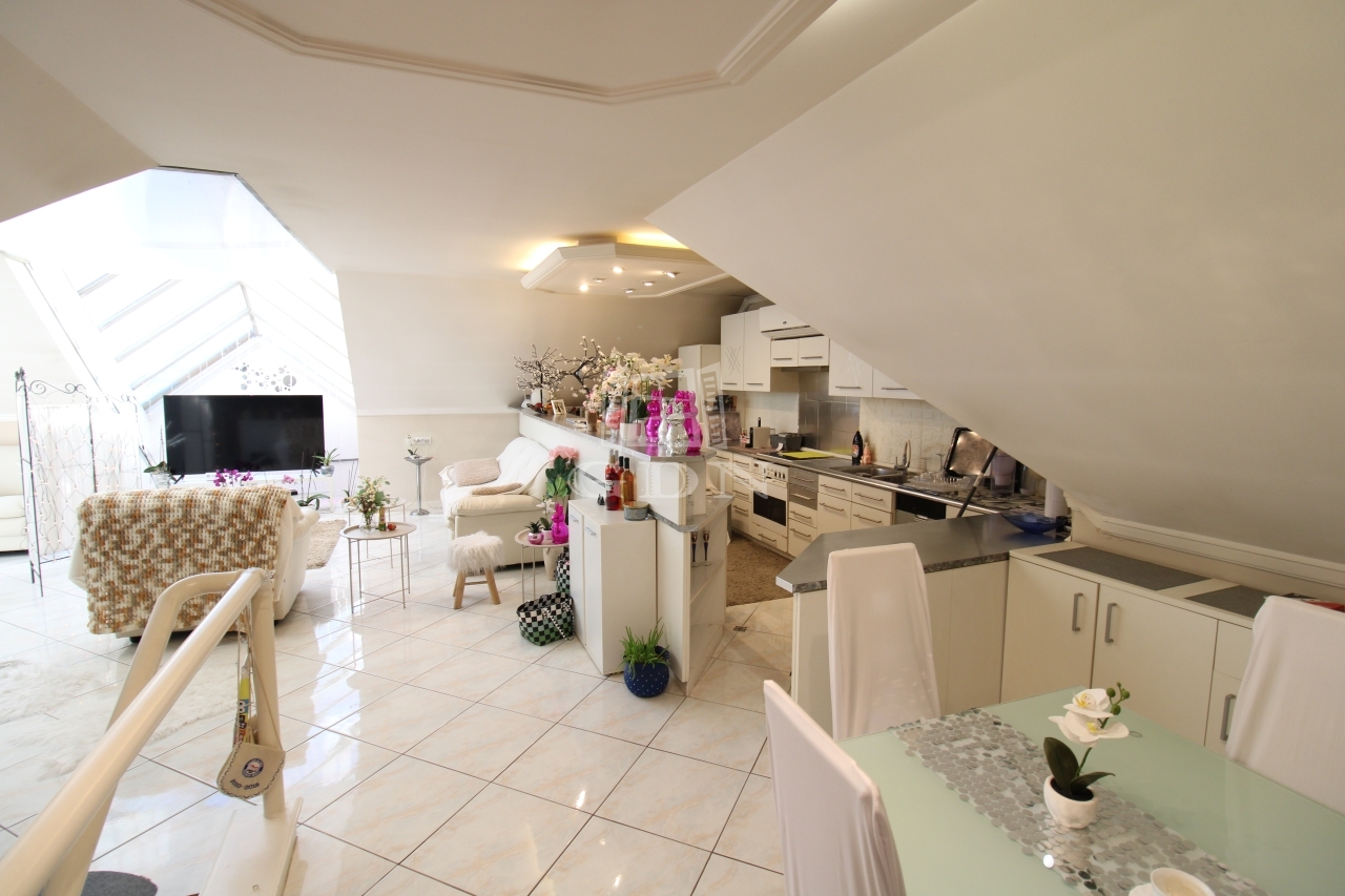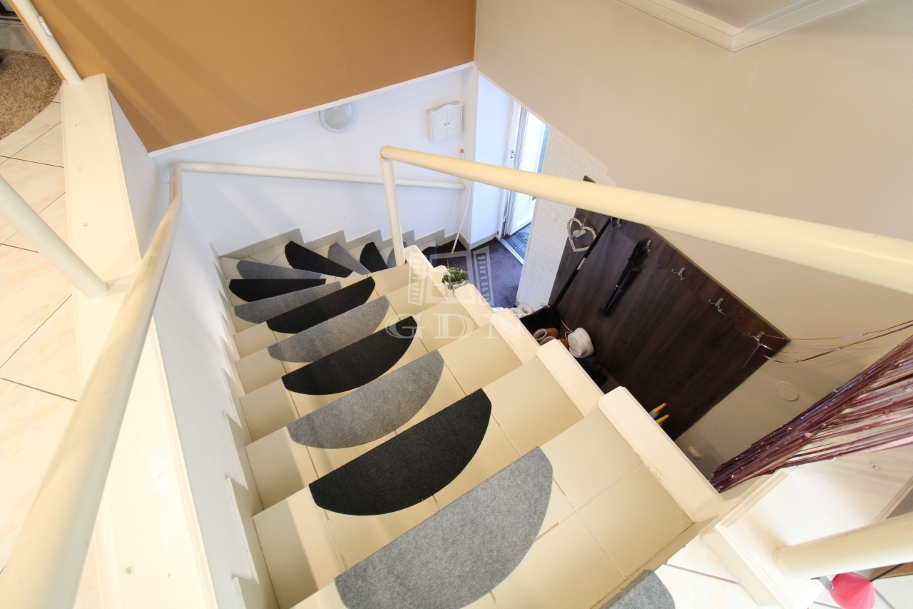 Felső szintre kényelmes fokkiosztású stabil lépcsőn juthatunk fel ahol is kettő félszoba, tágas világos fürdőszoba, illemhely és egy hatalmas amerikai konyhás nappali kapott helyet