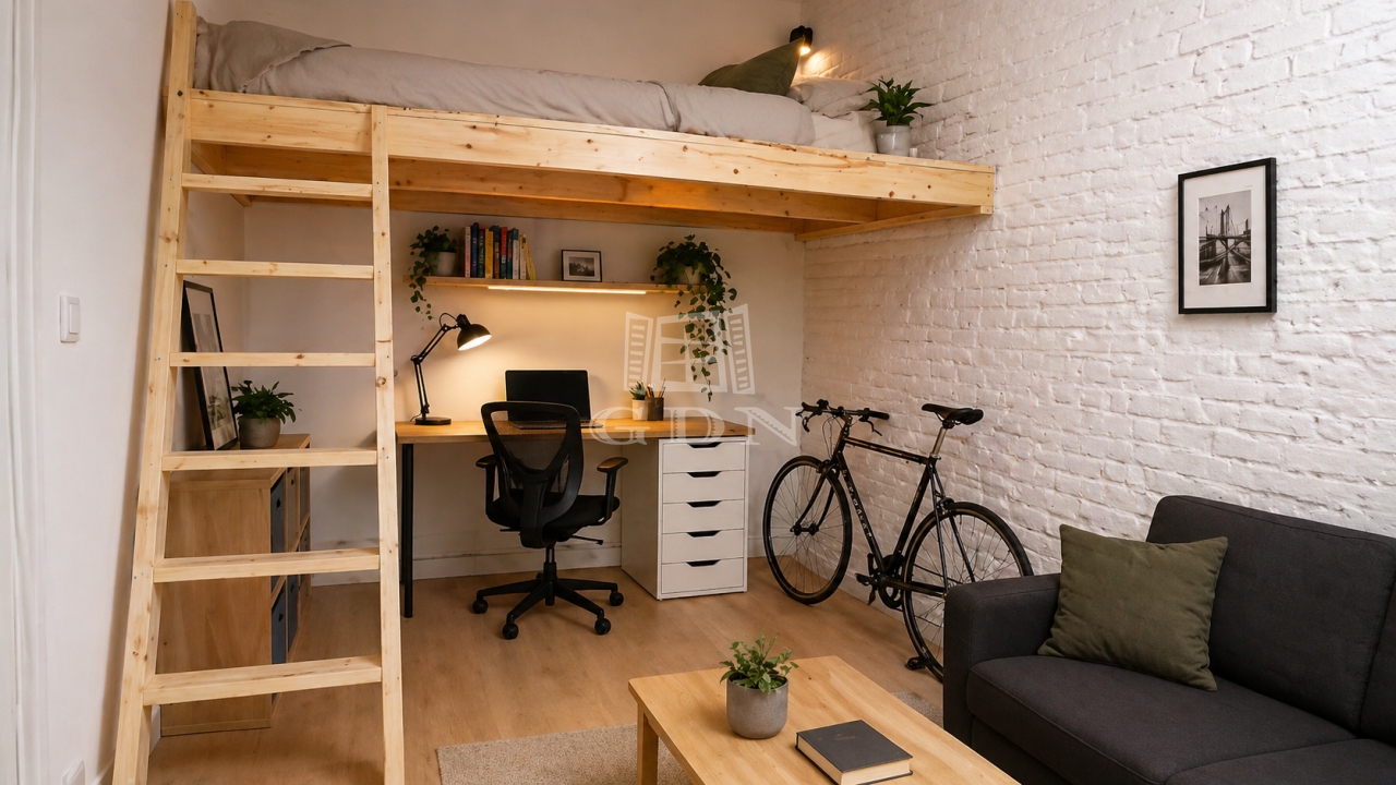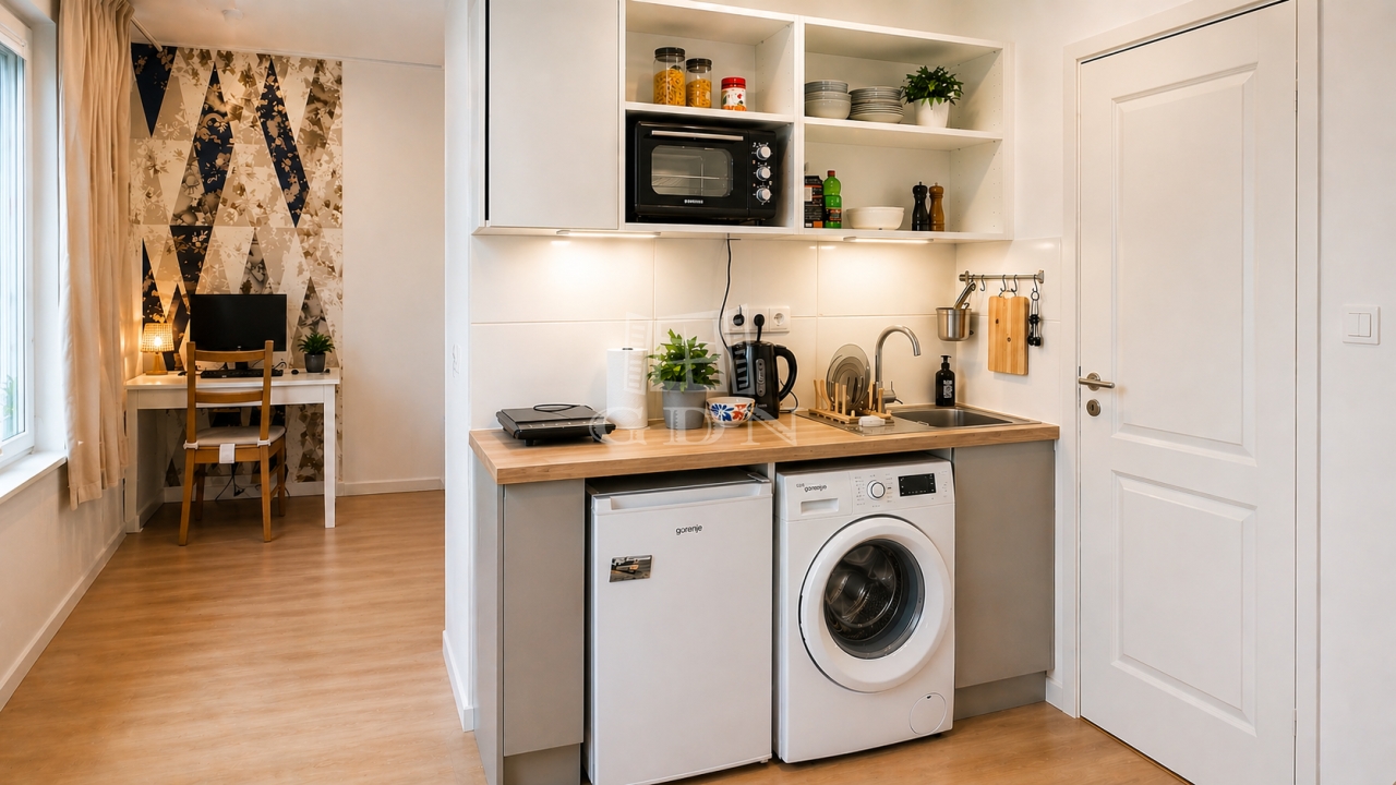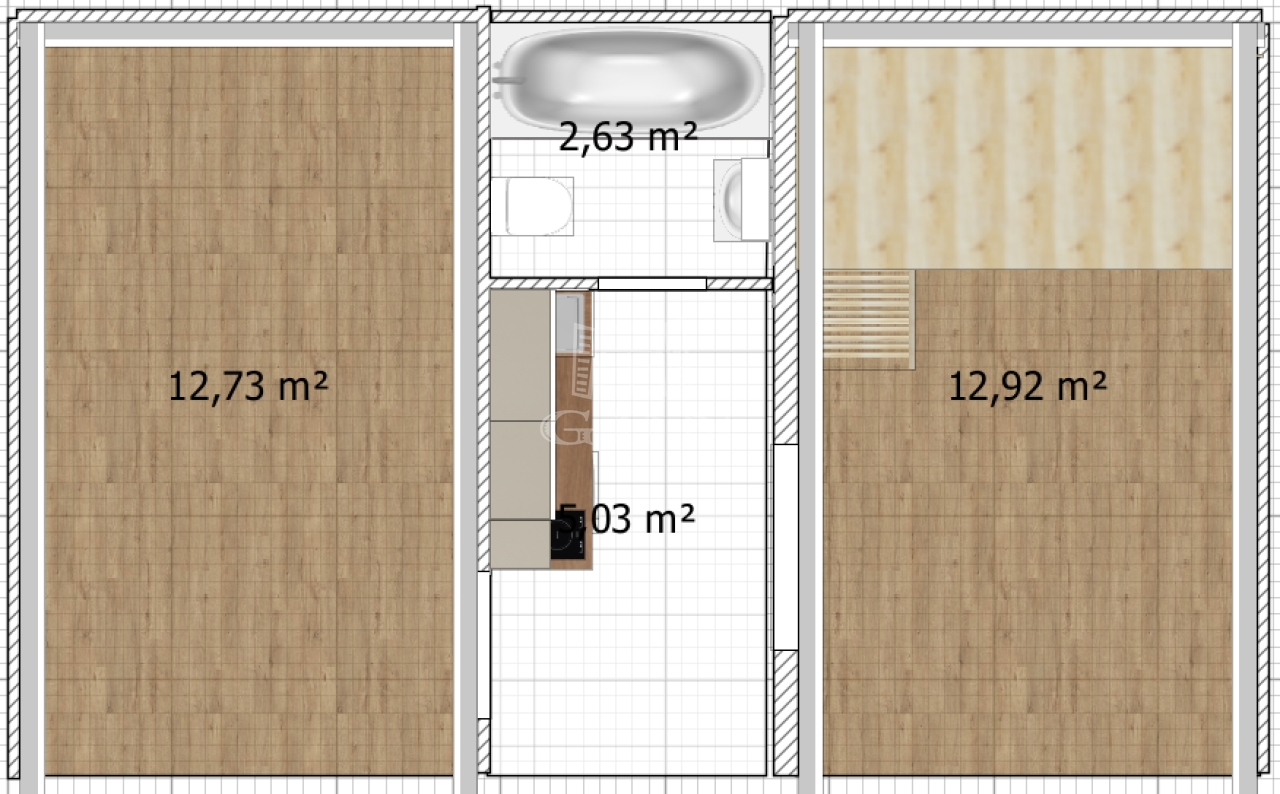 A lakás elosztása nagyon praktikus: konyha, fürdőszoba és KÉT KÜLÖN NYÍLÓ SZOBA, amelyből az egyik galériával ellátott.